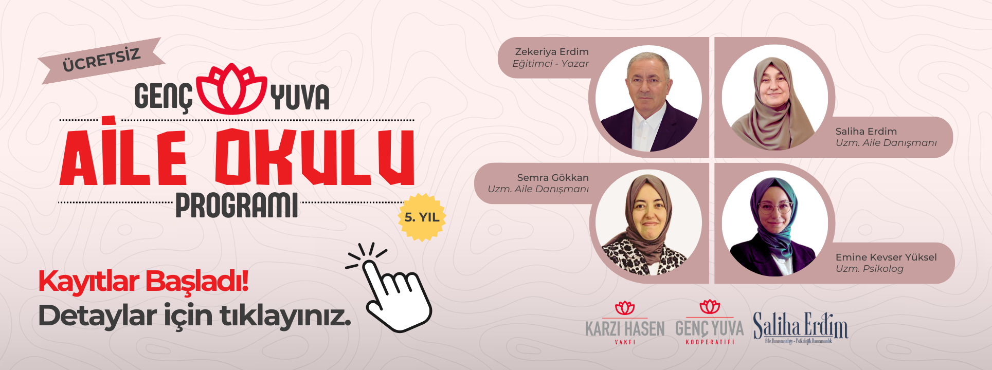 Program boyunca bu dört isim dönüşümlü olarak seminerler verecek; ayrıca her ay, dört eğitimcinin bir arada katılımıyla özel bir panel düzenlenecek. Bu yıl 5. yılını kutlayan Genç Yuva Aile Okulu, toplam 33 hafta sürecek eğitim programıyla gençlerin ve ailelerin ihtiyaçlarına rehberlik etmeyi hedefliyor.